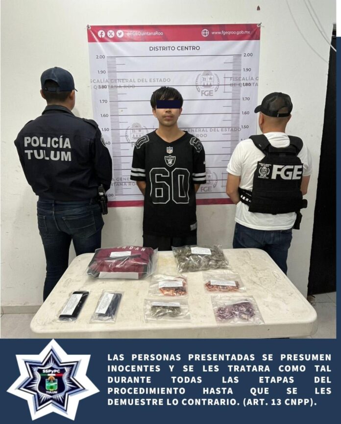 Tulum, Quintana Roo. Por su participación en delitos contra la salud, elementos de la Secretaría de Seguridad Pública y Protección Ciudadana de Tulum, así como de la Fiscalía General del Estado, detuvieron a Moisés Alejandro “N”.