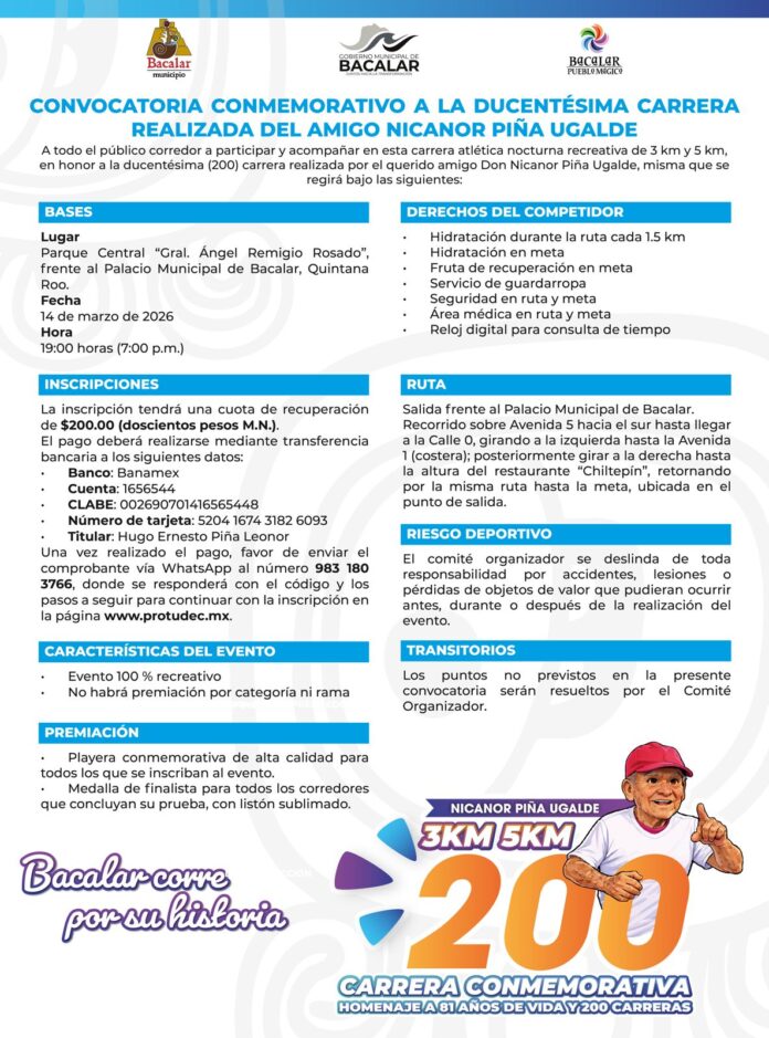 El Ayuntamiento de Bacalar invita a la ciudadanía a participar en la Carrera Conmemorativa que se realizará en honor a Don Nicanor Piña Ugalde, en el marco de la ducentésima (200) carrera realizada por este querido y emblemático corredor bacalarense, cuya trayectoria y calidad humana dejaron una huella imborrable en la vida deportiva y social del municipio.