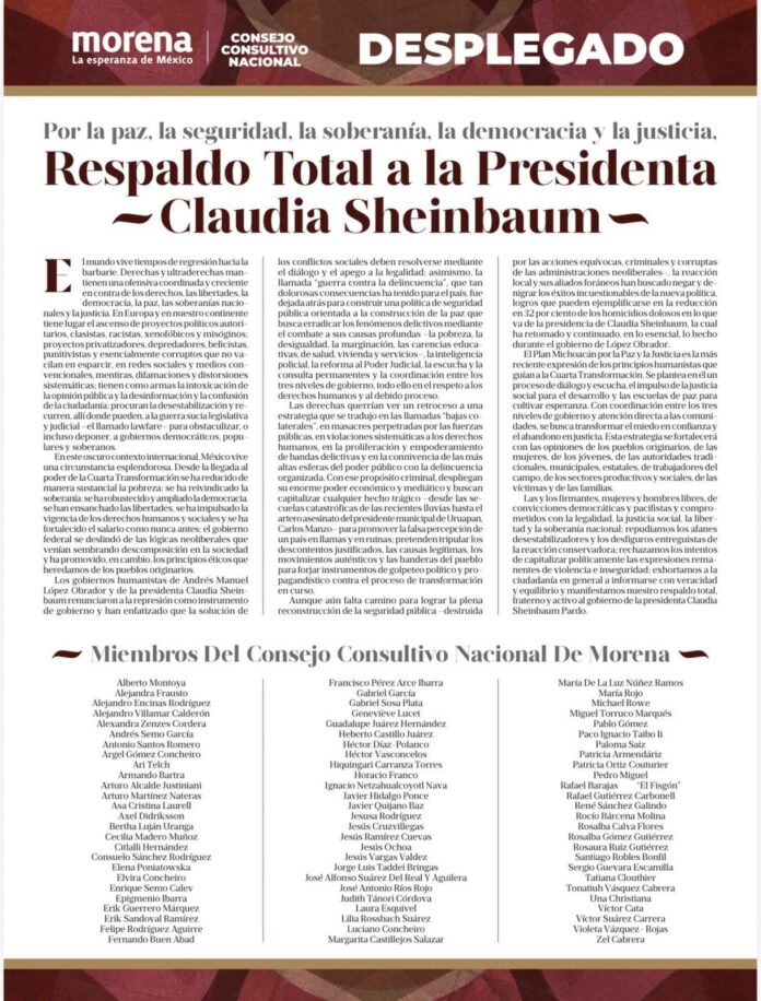 “Expresamos nuestro total respaldo a la presidenta @Claudiashein, a quien acompañamos en su compromiso con la paz, la seguridad, la soberanía y la justicia social.”
